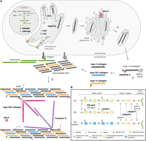 Schematic overview of collagen and glycosaminoglycan (GAG) biosynthesis and collagen fibrillogenesis. Molecules defective in Ehlers-Danlos syndromes (EDS) are highlighted in bold. |