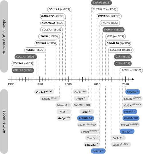 Timeline illustrating the first identification of molecular defects in human EDS (above timeline) and the first description of engineered animal models targeting an EDS-associated gene (below timeline). Human genes associated with EDS without a corresponding animal model are indicated in dark gray. Note that for some human EDS subtypes, biochemical and/or ultrastructural findings preceded the identification of the molecular defect. Mouse models are depicted in light gray and zebrafish models in blue. Bold indicates what was first, either the identification of the human disease gene or the generation of the engineered animal model. |
