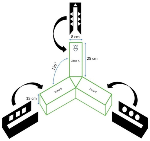 Schematic representation of Y maze apparatus, as in [30], with minor modifications. Removable arms were constantly swapped around. |