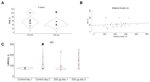Analysis of cognitive functions in adult zebrafish in the aquatic Y-maze test (panel (A), assessed as % of spontaneous alternation behavior, SAB, n = 9–19 per group, analyzed using the unpaired two-sample t-test and Pearson correlation (Panel (B)) and the inhibitory avoidance test (IAT, n = 9–19 per group, panel (C), analyzed using paired sample t-test). Data are presented as the violin and dot plots. Red dots with lines represent mean ± SD; * p < 0.05 vs. control fish, unpaired two-sample t-test, # p < 0.05 vs. control day 1, paired t-test. PHENOTYPE: