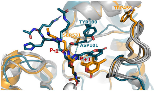 Key differences between HDAC6 and HDAC8 in the coordination of the substrate. The active sites of HDAC6 (receptor from PDB ID 6WSJ, substrate from 5EFN for visualization purposes, orange) and HDAC8 (PDB ID 2V5W, teal) are overlaid. The loops that distinguish the two HDACs are highlighted (orange and teal), together with conformations generated for modeling substrate activity (grey). Residues S531 (HDAC6) and D101 (HDAC8) that coordinate hydrogen bonding (light blue: HDAC6, yellow: HDAC8) to the backbone of the acetylated substrate lysine residue, are also highlighted, as well as positions W459 (HDAC6) and Y100 (HDAC8). The hydroxamic acid inhibitors are shown in sticks, and the catalytic Zn2+ ions are shown as a white sphere. See Text for more details. |
