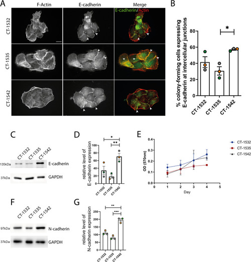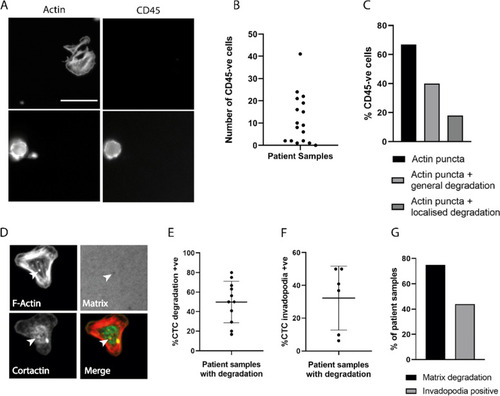 Circulating prostate tumour cells exhibit invadopodia activity. A circulating tumour cells (top) and hematopoietic cells (bottom) stained for CD45 and actin, imaged from the same field of view. B number of CD45-negative cells isolated from each blood sample. C percentage of CD45-negative cells displaying puncta and/or degradation. D PCa CTCs subjected to invadopodia assay and stained for F-Actin and Cortactin after 24 h incubation. Cells exhibited localised matrix degradation overlapping with actin puncta (white arrow) and cortactin puncta co-localising with actin (yellow arrow). E percentage of CTCs exhibiting matrix degradation properties. Samples without any visible degradation underneath CTCs were excluded. F percentage of CTCs exhibiting invadopodia formation in samples found positive for matrix degradation. Samples without any visible invadopodia activity were excluded. G percentage of samples with matrix degradation and invadopodia. Data are presented as Mean ± SD. Scale bar = 10 µm |