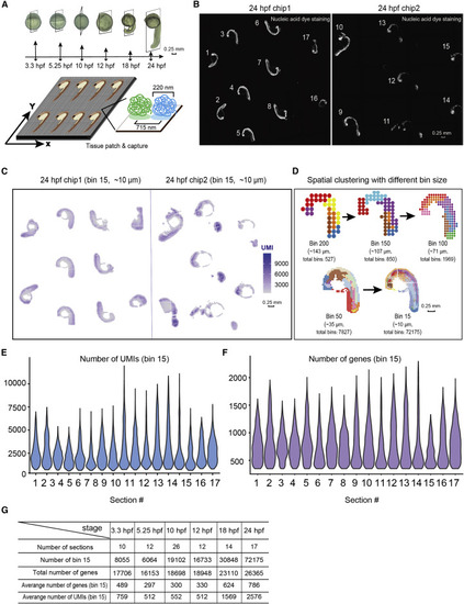 Figure 1. The Stereo-seq on multiple sections of the developing zebrafish embryos (A) Experimental outline (top): diagram of the zebrafish embryos and sagittal cryosections at different development stages which were subjected to Stereo-seq. Scale bars, 0.25 mm. Stereo-seq process diagram (bottom): the enlarged image shows the size of each spot and the distance between 2 adjacent spots. (B) Nucleic-acid dye staining of the 24-hpf zebrafish embryo sections attached on two 1-cm2 Stereo-seq chips. The number represents the serial number given to each section. Scale bars, 0.25 mm. (C) Spatial visualization of the distribution of captured transcripts (unique molecular identifiers [UMIs]) on all 24-hpf zebrafish embryo sections. Scale bars, 0.25 mm. (D) Unsupervised clustering of the 24-hpf zebrafish embryo section based on Stereo-seq data at different bin sizes. Scale bars, 0.25 mm. (E and F) Violin plot of the number of captured transcripts (E) and genes (F) of each 24-hpf zebrafish embryo section. (G) Table summarizing the numbers of sections used, total numbers of genes, total number of bins at bin-15 resolution, average captured number of UMIs, and genes at bin-15 resolution for each developmental stage in Stereo-seq. |