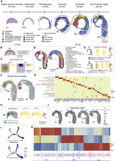 Figure 2. A spatial transcriptomic atlas of the developing zebrafish embryo (A) Unsupervised clustering of the zebrafish embryo section across sequential developmental stages analyzed by Stereo-seq at bin-15. Bins are colored by different regions. Scale bars, 0.25 mm. In this study, all sections from 10- to 24-hpf are displayed with head on the upper left and tail on the bottom right. The “#number” next to the sections represents the number given to each section, and all the sections in the following figures are marked with the “#number.” (B) Unsupervised clustering of the 3.3-hpf zebrafish embryo sections at bin-15. Bins are colored by spatial identities inferred from expressed marker genes. Scale bars, 0.25 mm. (C) The in situ hybridization images and the expression patterns of marker genes grhl3 and thy1 for superficial blastomere at 3.3-hpf. Scale bars, 0.25 mm. (D) Unsupervised clustering of the 24-hpf zebrafish embryo sections at bin-15. Bins are colored by spatial identities inferred from expressed marker genes. Scale bars, 0.25 mm. (E) Spatial visualization of indicated areas of the 24-hpf embryo on the left: detailed anatomical structures identified in the pronephros, and a combined structure including the spinal cord, the floor plate, and the notochord. The expression patterns of marker genes for each anatomical structure are shown on the right. Scale bars, 0.1 mm. (F) Unsupervised subclustering of the 24-hpf zebrafish nervous system. Bins are colored by spatial identities and cell types inferred from expressed marker genes. The subcluster colors are the same as the font colors of cluster names in (G). Scale bars, 0.25 mm. (G) Heatmap shows the mean expression level of marker genes between the indicated clusters of the zebrafish nervous system. (H) Spatial visualization of the hindbrain at 24-hpf, from left to right including indicated cell types and the expression of marker genes of different cell types. Scale bars, 0.25 mm. (I) Pseudotime analysis of hindbrain-related clusters as performed by Monocle 2. Bins are colored by cell types on the top (color legends of cell types are the same as those in Figure 2H) and colored by pseudotime stages on the bottom. (J) Spatial visualization of detailed structures of pseudotime states identified by Monocle 2 in the hindbrain on different sections at 24-hpf. Scale bars, 0.25 mm. (K) Heatmap shows the mean expression level of the top 30 DEGs different pseudotime states 1, 2, and 3. Representative genes related to each state are highlighted by red color. |