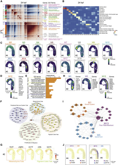 Figure 3. Spatial modules identified by hotspot uncover the interaction among spatial regions in 24-hpf zebrafish embryo (A) Heatmap shows the genes with significant spatial autocorrelation (12,675 genes, false discovery rate [FDR] < 0.05) grouped into 19 gene modules based on pairwise spatial correlations of gene expression in multiple sections of the 24-hpf zebrafish embryo. Selected genes and GO terms related to representative modules are highlighted on the right side. (B) Heatmap shows the ratio of the bins with high module scores (>3) in each module distributed in different spatial clusters, and the spatial clusters of the 24-hpf embryo are from Stereo-seq dataset in Figure 2D. (C) Spatial visualization of module scores for modules on 24-hpf embryo sections. Scale bars, 0.25 mm. (D) Spatial visualization of module 12 (M12). Scale bars, 0.25 mm. (E) Bar graph shows significantly enriched selected gene ontology terms in M12. (F) Protein-protein interaction (PPI) network of genes in M12. The network is visualized by Cytoscape. Node size represents the relative connectivity, and the TFs that interacted with sox10 are highlighted by red color. (G) Spatial expression pattern of genes in M12. These genes are related to the development of pigment cells fate (green), mesenchyme fate (orange), and sox10. Scale bars, 0.25 mm. (H) Spatial visualization of modules related to notochord/floor plate and neighboring tissues on 24-hpf embryo sections including M1, M5, and M13. Scale bars, 0.25 mm. (I) PPI network of interactive genes with shha/b in the three modules in Figure 3H. Representative genes are highlighted by red color. (J) Spatial expression patterns of shha and the interactive genes. Scale bars, 0.25 mm. |