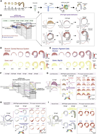 Figure 4. Construction of the spatially resolved developmental trajectories by integrated analysis of the scRNA-seq and Stereo-seq data (A) Schematic representation of the workflow for scRNA-seq of zebrafish embryos at different developmental stages using the C4 system and integrated analysis with a combination of the scRNA-seq and Stereo-seq data by applying SPOTlight. Scale bars, 0.25 mm. (B) Application of a Sankey diagram to visualize zebrafish embryo developing trajectory with scRNA-seq data. Two developmental branches which are developed from the presumptive ectoderm, namely, pigment cells, and central nervous system are simultaneously displayed on the Sankey diagram. (C) Application of SPOTlight to integrate Stereo-seq with scRNA-seq data to infer the spatially resolved developmental trajectories. Two developmental branches shown in (B) are simultaneously displayed on six sequential spatial sections to show the different spatial developmental trajectories. The graphs next to each section show bin counts distributions of corresponding cell types at two dimensions. The color legend is the same as that in Figure 4B. Scale bars, 0.25 mm. (D and E) Distribution of branch-specific gene module (top) and individual representative DEGs (bottom) of the central nervous system branch (D) and the pigment cells branch (E) on six sequential spatial sections. Scale bars, 0.25 mm. (F) Three selected developmental branch points at 3.3-, 12-, and 18-hpf. The late blastodisc (left), the lateral plate mesoderm (middle) and the neural crest (right), are shown in the Sankey diagram. (G–I) Cell-fate regulatory maps of different developmental destinations at 3.3-, 12-, and 18-hpf are related to Figure 4F. SPOTlight was applied to visualize the spatial distribution of cell subgroups with different differentiation together on one section (left) and separately on each section (middle); the graphs next to each section show bin counts distributions of corresponding cell types at both x and y axes (left). The spatial expression distributions of selected representative crucial TFs target genes are visualized on embryonic sections (right). Scale bars, 0.25 mm. |