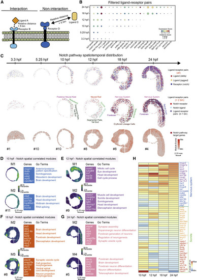 Figure 5. The relative spatial distance of different ligand-receptor pairs reveals the arrangement and interaction of signaling pathways (A) Model diagram of the analysis of ligand-receptor relative distance. (B) A dotted heatmap shows the expression scores and relative distance scores of ligand-receptor pairs that passed the filter (relative distance <5 bins in at least one time point, and correlation Pearson r > 0.5, p value < 0.05). (C) Spatial expression pattern of notch family genes (blue), deltal family genes (red), and jagged family genes (yellow) on embryo sections at the 6 time points (top). Spatial expression pattern of Notch receptors (red), ligands (blue) with a relative distances less than 2 bins, and the ligand-receptor pairs expressed in the same bin (purple) (middle). Spatial expression pattern of Notch target genes (red) on the embryonic sections at different time points (bottom). Scale bars, 0.25 mm. (D–G) Gene modules identified using hotspot show spatial correlation with Notch pathway in 10- (D), 12- (E), 18- (F), and 24-hpf (G) embryos. Module scores are plotted on the left, and selected genes and GO terms related to spatially correlated modules are highlighted on the right. Scale bars, 0.25 mm. (H) A heatmap shows the temporal expression changes of genes selected from modules in Figures 5D–5G. |