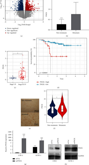 High expression of PNCK in NPC metastatic tissue. (a) The volcanic plot shows the distribution of significantly upregulated or downregulated differentially expressed genes using 5-metastatic and 5-non-metastatic NPC tissue samples; PNCK is among the upregulated genes. (b) Relative expression of PNCK evaluated by mRNA sequencing. (c) GSE102349 cohort indicating the higher PNCK expression in advanced stage (stage III-IV) as compared to the early-stage NPC patients (stage I-II). (d) GSE102349 cohort indicating that the higher PNCK expression is associated with worse PFS. (e) Validation of the PNCK protein expression using paraffin-embedded NPC nonmetastatic and metastatic tissues assessed by immunohistochemistry, and (f) the quantification of PNCK. Student's |