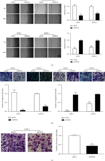 Representative results and quantification of in vitro experiments in generated NPC cell lines with PNCK overexpression (oePNCK) and PNCK knockdown (shPNCK). (a) PNCK knockdown inhibits NPC cell migration distance, while overexpression of PNCK promotes cell migration as seen in wound healing assays. (b, c) PNCK overexpression enhances the invasion and migration potential of NPC cells as assessed by transwell assays. Student's |