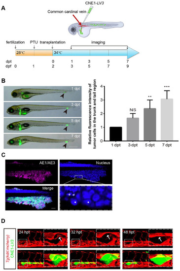 Transplantation of human NPC CNE1 cells into the CCV of zebrafish to observe the behavior of tumor cells. (A) Top: diagram of the establishment of zebrafish xenograft model. Bottom: experimental protocol. (B) Left: tumor cells transplanted into the circulatory system migrate to the tail region of zebrafish with blood flow and proliferated there. Black arrows indicate GFP-labeled tumor cells in the tail region. Scale bar: 3 mm. Right: the relative fluorescence intensity of tumor cells in zebrafish trunk and tail regions was quantified. The amount of tumor cells at 1 dpt was used as the baseline for comparison with that at other time points. Data were quantitatively analyzed by one-way ANOVA analysis (n = 4 fishes analyzed). (C) Zebrafish whole-mount immunofluorescence detection of the epithelial-derived tumor marker of AE1/AE3. Tumor cells that reached the tail region with blood flow were able to become tumorigenic in the zebrafish. Dashed line frames beneath are the high magnification of the region indicated. The nuclei of CNE1 cells are shown by white dots, and the nuclei of zebrafish are shown by white asterisks. The size of the nuclei of CNE1 cells is obviously larger than those of zebrafish. Scale bar: 50 μm. (D) Tumor cells were transplanted into the Tg(kdrl:mCherry) zebrafish circulatory system, and tumor cells migrated out from vessel lumen within 24–48 hpt in zebrafish tail. High magnifications of the regions (white dashed line) are shown on the right. White arrows point to the vessels (dorsal aorta) in the zebrafish. Scale bar: 50 μm. Data are shown as mean ± SD. NPC: Nasopharyngeal carcinoma; CCV: common cardinal vein; GFP: green fluorescent protein; PTU: phenylthiourea; dpt: days post-transplantation; dpf: days post-fertilization; hpt: hours post-transplantation; NS: not significant. **P < 0.01; ***P < 0.001. |