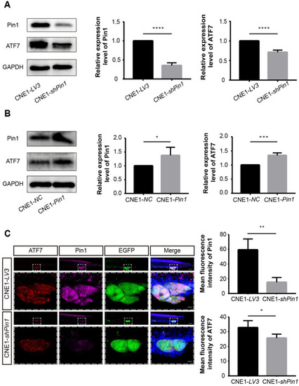The expression of ATF7 was correlated with the expression of Pin1. (A-B) Western blot analysis was used to detect the expression of ATF7 in Pin1-knockdown or Pin1-overexpressed CNE1 cells. The relative expression levels of Pin1 and ATF7 were quantified (n = 4 independent repeats). (C) Whole-mount embryo immunofluorescence staining of ATF7 expression in tumor cells transplanted in zebrafish. Images of selected areas (white dashed line) are shown at higher magnification below. Scale bar: 50 μm; 10 μm in the amplified image. The mean fluorescence intensity of Pin1 and ATF7 was analyzed quantitatively. The data were quantitatively analyzed by Student’s t test (CNE1-LV3 group, n = 5 transplanted fishes analyzed; CNE1-shPin1 group, n = 3 transplanted fishes analyzed). Data are shown as mean ± SD. GAPDH: glyceraldehyde-3-phosphate dehydrogenase; EGFP: enhanced green fluorescent protein. *P < 0.05; **P < 0.01; ***P < 0.001; ****P < 0.0001. |