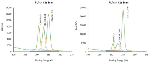 XPS high resolution spectra for C1s of printed PLA control (PLAC) and PLA sterilised with saturated steam (PLASS). |
