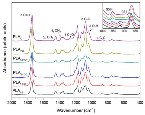 FTIR spectra of the PLA discs subjected to the different sterilisation treatments with absorption bands identified: PLAGR, PLASCCO, PLALTSF, PLASS and PLAHPGP together with the untreated PLA disc as control, PLAC. Amplification of the 400–2000 cm−1 wavenumber range in the inset with the two main peaks identified. |