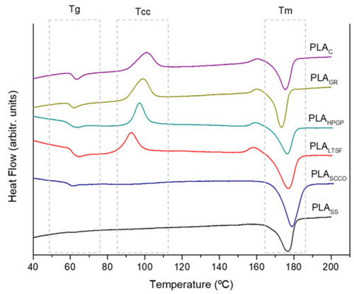 DSC thermograms for PLA discs subjected to the different sterilisation treatments: PLAGR, PLASCCO, PLALTSF, PLASS and PLAHPGP together with the untreated PLA disc as control, PLAC. |