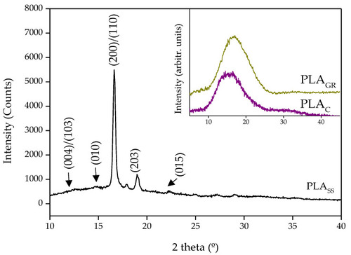 XRD diffraction pattern of untreated PLASS with the identification of the characteristic peaks and PLAC, and PLAGR diffraction pattern at the inset. |