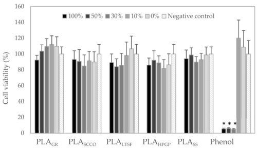 Cell viability detected in mouse fibroblast cells (NCTC clone 929) in the presence of different extracts of PLAGR, PLASCCO, PLALTSF, PLAHPGP and PLASS discs, compared to the positive control (phenol) and negative control (DMEM). Results are expressed as percentage compared to the negative control ± standard error. Statistical significance was determined to * ( |