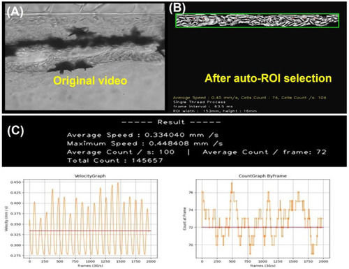 The computation of blood velocity and blood cell count in selected ROI and the displayed oscillation pattern over time in zebrafish aged 3 dpf. ( |