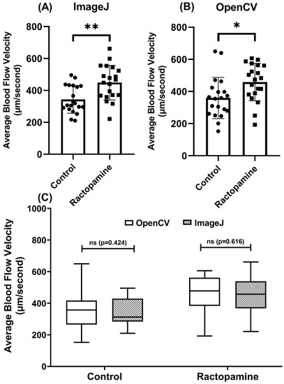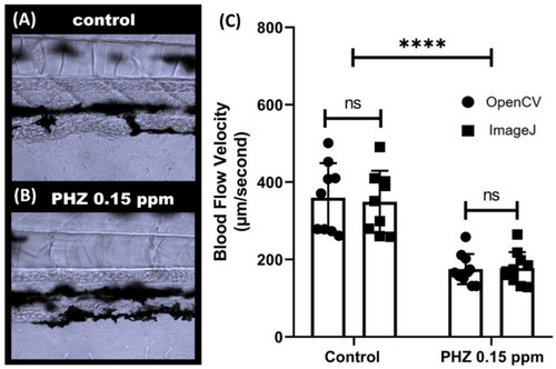 Validation of OpenBloodFlow method through comparison with ImageJ performance for blood flow velocity measurement in zebrafish larvae after exposure to control ( |