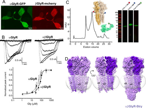 A Confocal fluorescent microscopy images of HEK 293 T cells showing GFP and mCherry expression, which respectively co-expressed with αGlyR and βGlyR subunits, via a bicistronic plasmid. βGlyR was transfected at a 5:1 excess, even though the mCherry fluorescence appears weaker. Generally, transfection efficiency was around 50%, and similar fluorescent images were observed for all cell plates used for electrophysiology. B Whole-cell current recordings from HEK 293 T cells transfected with only αGlyR (left) and with αGlyR and βGlyR (right) in response to glycine (concentration range: 1–1000 μM). Dose–response curves were generated from recordings on different batches of cells. The EC50 for αGlyR was 19 ± 11 μM (n = 5), and for αβGlyR was 63 ± 13 μM (n = 4). Data are presented as mean values ± standard deviation. C αβGlyR (coexpressed with Geph-E) was purified with a two-step affinity purification using subunit-specific affinity tags for βGlyR (1D4) and αGlyR (8xHis) followed by separation using size exclusion chromatography. The main peak (~14.8 ml) was at the elution volume expected for a pentameric assembly, and western blot analysis showed the peak contained all three expressed proteins. Similar gel filtration profiles were consistent for about 20 purifications in the course of this study. D Final cryo-EM reconstructions of αβGlyR-Stry. The density corresponding to the beta subunit is colored in a darker shade of purple. The left and center figures are shown at σ = 0.16, and the rightmost figure is shown at σ = 0.09 to highlight the diffuse ICD signal. |