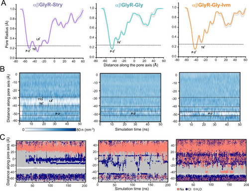 A Mean pore radius profile and standard deviations averaged across 50 ns equilibrium simulations for αβGlyR-Stry (left), αβGlyR-Gly (middle), and αβGlyR-Gly-Ivm (right) along the central pore axis. The one-standard-deviation range is shown as a gray band, and the thick line is the mean of a 50 ns simulation. B Water density within the channel pore. Each discrete water molecule position is associated with a Gaussian distribution, and the sum of all Gaussians yields the density function of water along the channel center line. Bulk water has a density of 33 nm−3. The time series of water density was calculated for 50 ns equilibrium simulations. C Trajectories along the pore axis of water molecules and ion coordinates within 10 Å of the channel axis inside the pore, in the presence of a +500 mV transmembrane potential difference (i.e., with the cytoplasmic side having a positive potential). No chloride permeation was observed past L9′ or P-2′ for αβGlyR-Stry, consistent with a closed channel state. No chloride permeation was observed past P-2′ for αβGlyR-Gly and αβGlyR-Gly-Ivm, consistent with a desensitized channel state. During all simulations, positional restraints were placed on the protein backbone, in order to preserve the experimental conformational state while permitting rotameric flexibility in amino acid side chains. |