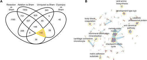 Biological process analysis of DEGs unique to different regeneration models. On the left, Venn diagrams of enriched Gene Ontology Biological Processes showing the specific GO:BP for each condition of interest analyzed labelled in color. On the right, Cytoscape representations of most enriched processes. Shown are data from the comparisons of the different injury models. (A) Uninjured vs sham, (B) Resection vs sham, (C) Ablation vs sham, (D) Cryoinjury vs sham, revealing no significantly enriched terms. |