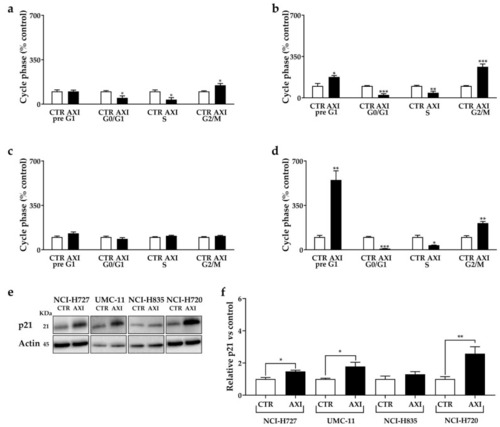 Effects of AXI on cell viability after 6 days of treatment. Dose response curves were generated after MTT (for NCI-H727 and UMC-11) or MTS (for NCI-H835 and NCI-H720) assays and are expressed as nonlinear regression (curve fit) of log (concentration drug) versus the percentage of vehicle control (CTR). Values represent the mean and S.E.M. of at least three independent experiments. * |