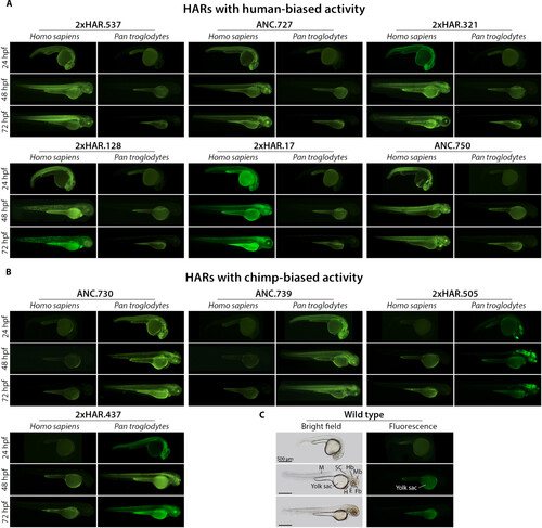 Comparative expression assays in transgenic zebrafish. RBFOX1-HARs with (A) human-biased and (B) chimp-biased activity. A representative image of the expression pattern driven by the human sequence (Homo sapiens) and its chimpanzee ortholog (Pan troglodytes) is shown at 24, 48, and 72 hpf. (C) Bright-field and fluorescent reference images of wild-type zebrafish. Note that the yolk sac of zebrafish emits autofluorescence. Fb, forebrain; Mb, midbrain; Hb, hindbrain; SC, spinal cord; E, eye; H, heart; M, muscle. All transgenic lines analyzed are included in fig. S3, and higher-magnification images are shown in fig. S4. |