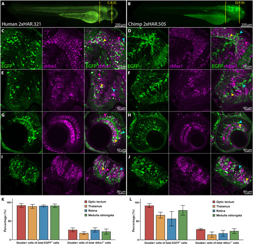 2xHAR.321 and 2xHAR.505 drive expression to rbfox1 cells in zebrafish. Representative transgenic zebrafish expressing EGFP under the control of (A) 2xHAR.321 human sequence and (B) 2xHAR.505 chimpanzee sequence at 72 hpf. Yellow bars indicate the approximate location of the coronal cryosections. (C to J) Confocal microscopy images of cryosections showing EGFP and rbfox1 expression on the [(C) and (D)] optic tectum, [(E) and (F)] thalamus, [(G) and (H)] retina, and [(I) and (J)] medulla oblongata. (K and L) Quantification of double-positive cells of total EGFP-positive or rbfox1-positive cells for (K) 2xHAR.321 and (L) 2xHAR.505. Arrows indicate examples of double-expressing cells (yellow), rbfox1-expressing cells (pink), and EGFP-expressing cells (light blue). |