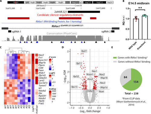 Gene expression analysis in Rbfox1Δ2xHAR.321/Δ2xHAR.321 mice. (A) Generation of 2xHAR.321 knockout mice. Two sgRNAs were designed at the ends of the target sequence, and the result was confirmed by sequencing. Candidate silencer regulatory elements lifted over from the human genome are included (40). Below the level of sequence conservation, arrows indicate the presence of substitutions; black arrows are human-specific substitutions, and blue arrows are chimpanzee-specific substitutions. (B) Rbfox1 relative expression in the midbrain at E14.5. Expression quantification was performed using the 2−ΔΔCt method with Actb as the reference gene, and the comparison between wild-type (Rbfox1+/+; wild type) and Rbfox1Δ2xHAR.321/Δ2xHAR.321 mice (knockout) was performed using the Student’s t test (n = 6; P = 0.0040). a.u., arbitrary unit. (C) Heatmap of top up-regulated and down-regulated genes. Each row represents a gene, and each column represents a sample. (D) Volcano plot showing the statistical significance (−log10FDR) versus the magnitude of change (log2FC) of the DEGs. (E) Proportion of DEGs with evidence of Rbfox1 direct binding as identified by iCLIP experiments from whole mouse brain (43). |