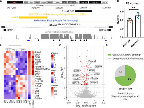 Gene expression analysis in Rbfox1Δ2xHAR.505/Δ2xHAR.505 mice. (A) Generation of 2xHAR.505 knockout mice. Two sgRNAs were designed at the ends of the target sequence, and the result was confirmed by sequencing. Candidate cis-regulatory elements from ENCODE are included (76). Below the level of sequence conservation, arrows indicate the presence of substitutions; black arrows indicate human-specific substitutions, and blue arrows point to chimpanzee-specific substitutions. (B) Rbfox1 relative expression in the cerebral cortex at P8 is shown. Expression quantification was performed using the 2−ΔΔCt method with Actb as the reference gene, and the comparison between wild-type (wild type) and Rbfox1Δ2xHAR.505/Δ2xHAR.505 mice (knockout) was performed using the Student’s t test (n = 6; P = 0.0052). (C) Heatmap of top up-regulated and down-regulated genes. Each row represents a gene, and each column represents a sample. (D) Volcano plot showing the statistical significance (−log10FDR) versus the magnitude of change (log2FC) of the DEGs. (E) Proportion of DEGs with evidence of Rbfox1 direct binding as identified by iCLIP experiments from whole mouse brain (43). |