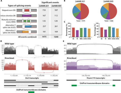 AS is altered in Rbfox1Δ2xHAR.321/Δ2xHAR.321 and Rbfox1Δ2xHAR.505/Δ2xHAR.505 mutant mice. (A) Types of AS events and the number of statistically significant events (FDR < 0.05; ΔPSI > 0.1) found in 2xHAR.321 and 2xHAR.505 knockout mice. (B) Pie chart showing the breakdown of AS events. (C) Proportion of differentially spliced genes with evidence of Rbfox1 direct binding as identified by iCLIP experiments from whole mouse brain at P15 (43). (D and E) Sashimi plots of selected examples of (D) exon skipping (Stx3) and (E) RI (Tmem175) in the Rbfox1Δ2xHAR.321/Δ2xHAR.321 mutant versus wild-type mice. Sashimi plots show the density of reads for each alternative exon or intron depicted below for each gene transcript. Arcs in the plots represent splice junctions that connect exons, and the number on each arc is the junction depth (number of junction reads). Important protein domains from UniProt are shown below the gene transcripts. Validation experiments for Stx3 and Tmem175 are included in fig. S10. |