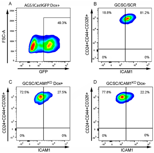 GCSC/ICAM1KO transduction efficiency 48 h post-induction. (A) AGS/iCas9GFP transduced with sgRNA-SCR Dox+. (B) AGS/iCas9GFP transduced with ICAM1-sgRNA 1/2 Dox−. (C) AGS/iCas9GFP transduced with ICAM1-sgRNA 1/2 Dox+. (D) Merge between blot B (red population) and blot C (blue population) panels. Dox (doxycycline). |
