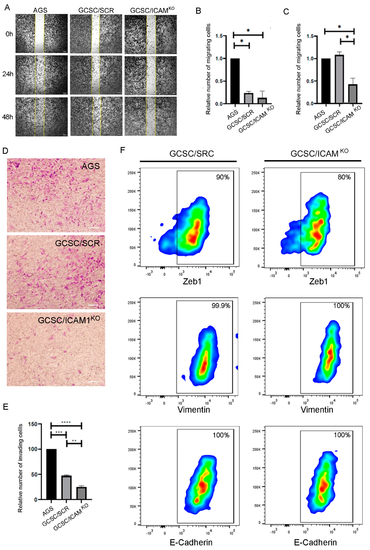 GCSC/ICAM1KO cells lost their ability to migrate and invade but did not alter the expression of EMT markers. (A) Representative images of the migration assay; GCSC/ICAM1KO cells exhibited a decreased ability to migrate at 24 h and 48 h, 4X. Bars indicate 200 µm. (B,C) A quantitative analysis of the relative number of migrating cells represented in (A) at 24 (B) and 48 h (C); n = 3 per group. (D) Representative images of the invasion assay; GCSC/ICAM1KO cells exhibited a decreased ability to invade at 24 h, 20X. Bars indicate 100 µm. (E) A quantitative analysis of the invasion assay. The values represent the mean ± SD of three independent experiments and are expressed in relative percentages. Asterisks indicate the comparison made between groups. * p < 0.05, ** p < 0.01, *** p < 0.001, and **** p < 0.0001. (F) A representative dot plot showing the effect of ICAM1 deletion on the expression level of EMT-related proteins. |