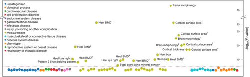 Phenome-wide association analysis of rs4727341, the top risk variant. Phenotype-wide association analysis of complex traits associated with rs4727341. Summary statistics from the UK Biobank, FinnGen, and genome-wide association study catalog repositories were downloaded from Open Target (https://genetics.opentargets.org/). Only traits with P value < .005 are shown in the diagram. x axis shows traits and y axis shows the variant’s P value of association to each trait. The circles are color coded by the trait category (see legend) as reported in Open Target website. The red dashed line shows the significance threshold corrected for the number of traits shown. In the figure, heel bone mineral density and other traits appear multiple times since the association was reported in many independent studies/publications as follows: heel bone mineral density (Heel BMD): 1GCST006979, 2GCST006288, 3NEALE2_3148_raw, 4NEALE2_78_raw (t score automated), 5NEALE2_4125_raw (t score automated right), 6NEALE2_4124_raw (right); cortical surface area: 1GCST010282_20: pars triangularis, 2GCST010701: MOSTest, 3GCST010697: min P and 4GCST90091060; other heel measurements are also shown—heel broadband ultrasound attenuation (heel bua): NEALE2_3144_raw: direct entry and NEALE2_4120_raw: right); and heel quantitative ultrasound index (heel qui): NEALE2_3147_raw: direct entry and NEALE2_4123_raw: right. |