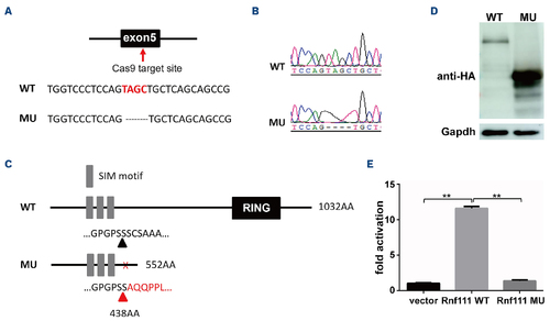 Generation of the Rnf111 mutant line. (A) The Cas9 target site was in the fifth exon; 4 base pair (bp) nucleotides were deleted. (B) The wild-type and mutant sequencing peak maps. (C) Schematic representation of wild-type and mutant Rnf111 proteins. (D) Western blot of HA-tagged wild-type and mutant Rnf111 proteins expressed in HEK293T cells. (E) CAGA12-luciferase transcriptional reporter assay of wild-type and mutant Rnf111. The data are presented as mean ± standard deviation with **P<0.01. WT: wild-type; MU: Rnf111 mutants with deletion of 4 bp; SIM: SUMO-interacting motifs. |