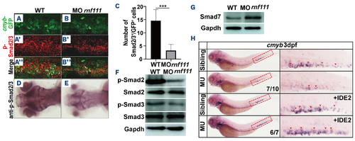 Analysis of p-Smad2/3, Smad7 and IDE2 rescue assay in Rnf111-deficient embryos. (A, A’, A’’, B, B’, B’’) Double immunostaining of anti-GFP (A, B) and anti-p-Smad2/3 (A’, B’) in the caudal hematopoietic tissue of the transgenic Tg (cmyb-EGFP) line at 3 dpf. The bottom panel shows merged images (A’’, B’’). White arrows indicate p-Smad2/3 and cmyb-EGFP double-positive cells. (C) Statistics of p-Smad2/3 and cmyb-EGFP double-positive cells. The data are presented as mean ± standard deviation with ***P<0.001. (D, E) Immunohistochemistry of p-Smad2/3. (F) Western blot analysis of p-Smad2, Smad2, p-Smad3 and Smad3. (G) Western blot analysis of Smad7. (H) Whole-mount in situ hybridization analysis of rescue efficiency of IDE2. Red arrows indicate cmyb-positive hematopoietic stem and progenitor cells in the caudal hematopoietic tissue. All experiments were independently replicated at least three times. WT: wild-type; MO rnf111: rnf111 morphants; GFP: green fluorescent protein; MU: Rnf111 mutants with deletion of 4 base pair nucleotides; IDE2: definitive endoderm 2 inducer; EGFP: enhanced green fluorescent protein; dpf: days post-fertilization. |
