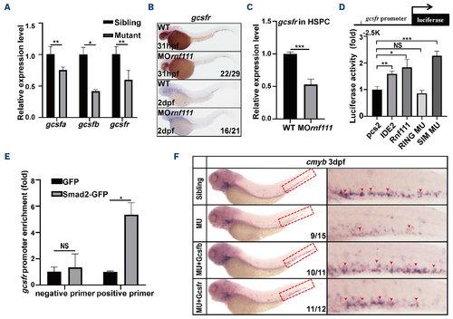 Gcsf signaling was the downstream target of Rnf111-Smad2/3. (A) Real-time quantitative polymerase chain reaction (qPCR) of gcsfa, gcsfb and gcsfr in siblings and mutants at 3 dpf. The data are presented as mean ± standard deviation (SD) with *P<0.05, **P<0.01. (B) Whole-mount in situ hybridization analysis of gcsfr. (C) Real-time qPCR of gcsfr in HSPC of rnf111 morphants. The data are presented as mean ± SD with ***P<0.01. (D) Luciferase assay of gcsfr promotor in HEK293T cells. The data are presented as mean ± SD with *P<0.05, **P<0.01, ***P<0.001, NS: no significant difference. (E) Chromatin immunoprecipitation qPCR assay of Smad2-GFP binding to gcsfr promotor at 2 dpf. The data are presented as mean ± SD with *P<0.05, NS: no significant difference. (F) Rescue assay of gcsfb and gcsfr RNA in Rnf111 mutants. Red arrows indicate cmyb-positive hematopoietic stem and progenitor cells in the caudal hematopoietic tissue. All experiments were independently replicated at least three times. WT: wild-type; MO rnf111: rnf111 morphants; HSPC: hematopoietic stem and progenitor cell; IDE2: definitive endoderm 2 inducer; RING MU: Rnf111 RING mutant with the RING domain mutated; SIM MU: Rnf111 SIM mutant with three SUMO-interacting motifs all mutated; GFP: green fluorescent protein; MU: Rnf111 mutants with deletion of 4 base pair nucleotides; hpf: hours post-fertilization; dpf: days post-fertilization. |