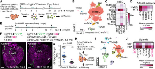 β-cat ON CMs are required for CV arterialization (A) An experimental design of preparation of cells followed by scRNA-seq. fli1:EGFP+ cells were collected from the fish treated with DMSO or 5 mM MTZ every 2 days. (B) Uniform manifold approximation and projection (UMAP) visualization of integrated cells from DMSO-treated and MTZ-treated hearts. Cells are color-coded by type. endoEC, endocardial EC; coEC, coronary EC; vEC, valvular EC; Epi, epicardial cells; FB, fibroblasts; Eryth, erythrocytes; T, T cells; NK, natural killer cells; B, B cells; Mϕ, macrophages; Throm, thrombocytes. (C) A matrix plot of coEC marker gene expression (bottom) in each cluster (left) shown in (B). (D) A matrix plot of arterial marker gene expression (bottom) of coECs from hearts treated with DMSO (upper) or MTZ (lower). (E) Experimental design to analyze the CV of the fish used in (F). Fish were treated with 5 mM MTZ every 2 days and analyzed after 15 days of treatment. (F) Representative images of arteries and CVs of control or Tg(DLL4:EGFP);Tg(myl7:GAL4db-TCFΔC);Tg(5xUAS:TagBFP-2A-NTR2.0) fish at 1.5 months treated with MTZ. A control heart (left) and a β-cat ON CM-ablated heart (right). (G) Quantitative analysis of the data shown in (F). (H) Experimental design for preparing the cells at the AVC followed by scRNA-seq. The fish indicated at the top treated with DMSO for 48 h were used. (I) UMAP visualization of cells obtained from the AVC of the fish in (H) at 1 month. Cells are color-coded by type. vFB, valvular FB; SM, smooth muscle cells. (J) A matrix plot of ligand expression (bottom) in β-cat OFF (mC−) and ON (mC+) CMs of the AVCs at 1 month. Scale bars, 100 μm. Data are mean ± SEM. Statistical analysis was performed by two-tailed Student’s t test. BF, bright field. See also Figure S4 and Table S2. |