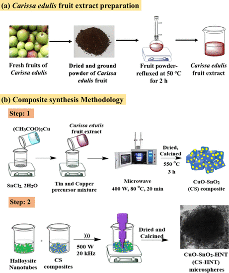 Figure 1. (a) Preparation of C. edulis fruit extract. (b) Schematic representation of the synthesis of the CuO/SnO2/HNT composite using C. edulis fruit extract. |