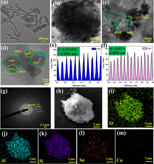 Figure 2. TEM images of (a) pristine HNT, (b) the 20CS-HNT composite (at 200 nm), and (c) the 20CS-HNT composite (at 20 nm). (d) HR-TEM image of the 20CS-HNT composite (at 5 nm). d spacing values of (e) SnO2 and (f) CuO. (g) SAED pattern of the 20CS-HNT composite. Elemental mapping images of the 20CS-HNT composite: (h) overall image, (i) oxygen, (j) aluminum, (k) silicon, (l) tin, and (m) copper. |