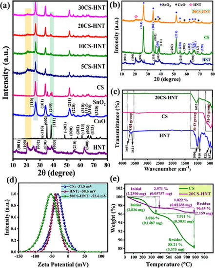 Figure 3. (a) XRD data of pristine compounds and various loadings of the CS-HNT composite. (b) XRD data of raw HNT, CS, and the 20CS-HNT composite. (c) FT-IR spectra of pure HNT, CS, and the 20CS-HNT composite. (d) Analysis of the ζ potentials of CS, HNT and, the 20CS-HNT composite. (e) Thermal stability of CS and 20CS-HNT composite. |