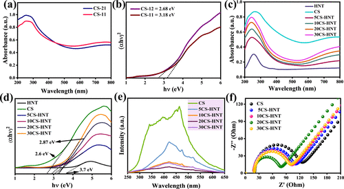 Figure 4. (a) UV–vis–DRS spectrum. (b) Tauc’s plot of CS-21 and CS-11. (c) UV–vis–DRS spectrum. (d) Tauc’s plot of pure HNT, CS, and several CS-HNT composites. (e) PL spectra and (f) EIS spectra of CS and various synthesized composites. |
