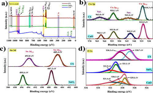 Figure 5. (a) XPS survey spectrum. HR-XPS data of (b) Cu, (c) Sn, and (d) O for CuO, SnO2, and the CS composite. |