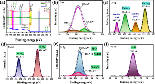 Figure 6. (a) XPS survey spectrum. HR-XPS data of (b) O, (c) Cu, (d) Sn, (e) Si, and (f) Al for the 20CS-HNT composite. |