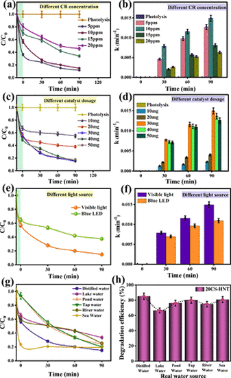 Figure 7. Optimization parameters of photocatalytic CR removal by 20CS-HNT composite: (a) C/C0 and (b) rate constant at different CR concentrations, (c) C/C0 and (d) rate constant at different catalyst dosages, and (e) C/C0 and (f) rate constant with different light sources. CR degradation by the 20CS-HNT photocatalyst using a real water source: (g) C/C0 and (h) degradation efficiency. |
