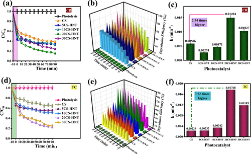 Figure 8. CR photodegradation by 20CS-HNT composite: (a) C/C0, (b) degradation efficacy, and (c) rate constant. TC photodegradation by 20CS-HNT composite: (d) C/C0, (e) degradation efficacy, and (f) rate constant. |