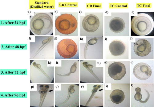 Figure 10. (c) Morphological abnormalities of Zebrafish embryos at different time using standard, CR control, CR final, TC control, and TC final samples. |