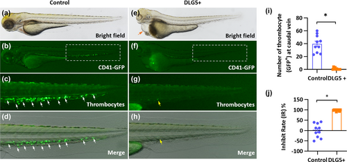 Over-expression of human DLG5 causes thrombocytes loss in zebrafish. (a–h) Gross morphology of Tg (CD41: GFP) zebrafish embryos at 3-dpf. Compared with control zebrafish (empty vector), human DLG5 over-expression (DLG5+) causes pericardial oedema (e, red arrowhead) and thrombocyte loss (g, h, yellow arrows). (i,j) Quantification of the average number of thrombocyte (GFP+) at caudal vein. Error bars, mean ± SEM.; *P < 0.05 (n = 10; Student's t test). dpf, days post fertilization. |