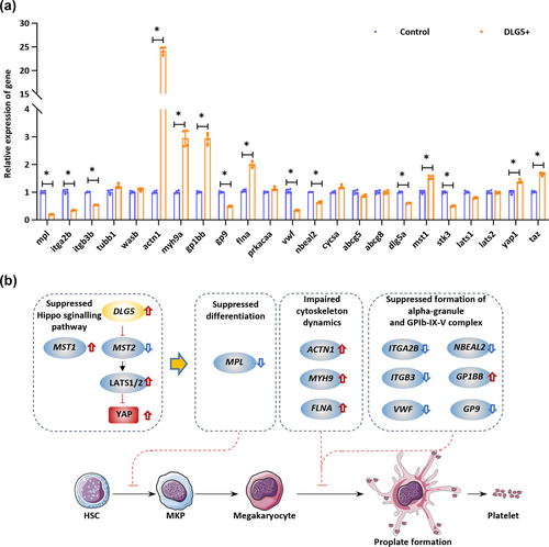 Effect of human DLG5 over-expression on signalling pathways in zebrafish. (a) Endogenous mpl, itga2b (ITGA2B), itgb3b (ITGB3), tubb1, wasb (WAS), actn1, myh9a (MYH9), gp1bb, gp9, flna, prkacaa, vwf, nbeal2, cycsa (CYCS), abcg5, abcg8, dlg5a (DLG5), mst1, stk3 (MST2), lats1, lats2, yap1 (YAP) and taz in WT control (empty vector) and human DLG5 injected embryos assessed by qRT-PCR (n = 10 individual embryos). * P < 0.05. (b) DLG5 over-expression causes changes in expression levels of ‘genes’ involved in MK growth, differentiation and maturation. The red and blue arrows colours indicate upregulated and downregulated molecules, respectively. |