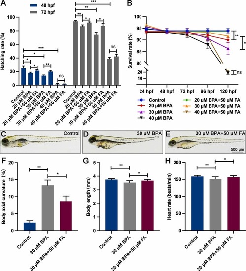 FA can improve the developmental toxic effects induced by BPA exposure in zebrafish embryos or larvae. (A) FA has the potential to enhance the hatchability of zebrafish embryos exposed to BPA. (B) The survival rate of larvae exposed to BPA can be improved by FA. (C-E) The images depict the control group, as well as larvae exposed to 30 µM of BPA alone or in combination with 50 µM of FA at 120 hpf. (F) The proportion of BPA-induced spinal curvature phenotypes in larvae can be alleviated by FA. (G) The phenotype of body length reduction in larvae induced by BPA exposure can be rescued by FA (n=9). (H) FA can mitigate the decreased heart rate phenotype induced by exposure to BPA in larvae (n=9). The significance levels are denoted as follows: *P<0.05; ** P<0.01; *** P<0.001; and "ns" indicates not significant. The error bars in the figures depict the standard error of the mean. |